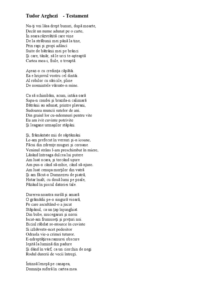 Arghezi Testament Source from : https://es.scribd.com/doc/159485791/Arghezi-Testament Rolul poeziei este acela de de transfigurare a oricaror aspect ale realitatii, prin cuvant si imagine artistica: Filmul acestui proiect, waste land. Povestea dintre marean şi oana, pe fondul urletelor din piaţa universităţii, e absolut fascinantă. Muzeul brăilei a organizat luni, 3 noiembrie 2008, vernisajul expoziţiei „din bube, mucegaiuri şi noroi. prilejuită de cercetările arheologice din centrul istoric al oraşului brăila. Din bube mucegaiuri si noroi.