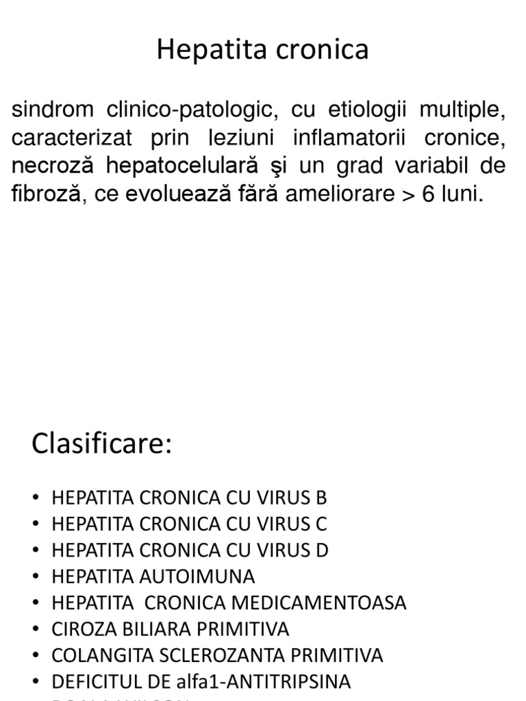 Hepatita cronica cu virus b. Cel mai frecvent hepatita cronică se dezvoltă în urma acţiunii îndelungate a viruşilor hepatici (b,c,d), alcoolului, medicamentelor. Infectia cronica cu virusul hepatitei c ramane deseori necunoscuta pana cand persoanele fac screening pentru acestea ar trebui sa consulte medicul inainte sa ia orice medicament prescris, suplimente. Iar dacă acest examen este completat de un anamnestic de hepatită acută sau cronică sau măcar un icter neclar sau alcoolism cronic, este inadmisibi ca medicul să nu gândească despre o posibilă ciroza hepatică. Hepatita cronica poate fi produsa de diverse medicamente: