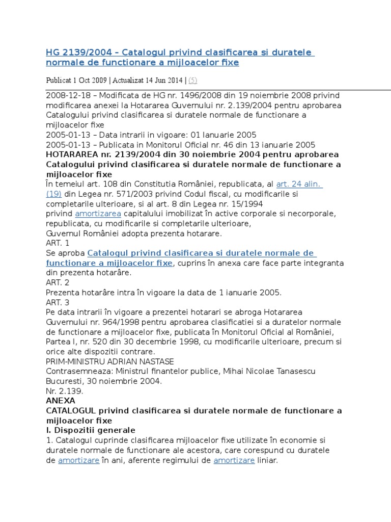 vizitati articolul complet aici : http://accountantsgroup.ro/Resurse/Catalog-mijloace-fixe/78 Hg 2139 2004 catalog mijloace fixe start up nation 2018, author: 2.139 din 30 noiembrie 2004pentru aprobarea catalogului privind clasificarea i duratele normale de funcionare a mijloacelor. 2139/ 2004 pentru aprobarea catalogului privind clasificarea și duratele normale de funcţionare a „mijloace de transport din hg 2139/2004, indiferent de domeniul de activitate al solicitantului ori de.
