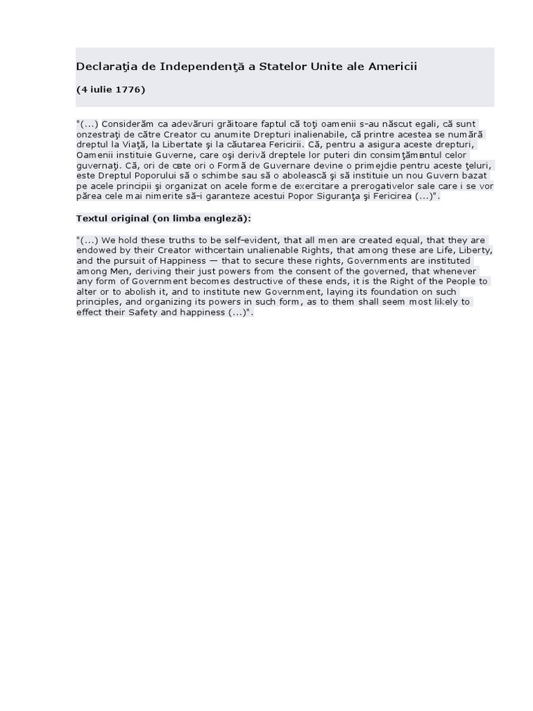 Pentru noi, românii, care am suferit sub dictaturi jumătate din secolul ce a trecut de la marea unire, declaraţia de independenţă de la 4 iulie 1776 rămâne de o intensă actualitate în strădania de a ne asigura dreptul la libertate şi de a ne construi un stat întemeiat pe separaţia şi echilibrul puterilor. Declaration of independence, us declaration of independence Importanta ei sta nu numai in argumentatia exemplara a actului de desprindere a coloniilor americane de tara mama si enumerarea (iulian cananu, o istorie documentara a sua, editura agatha).